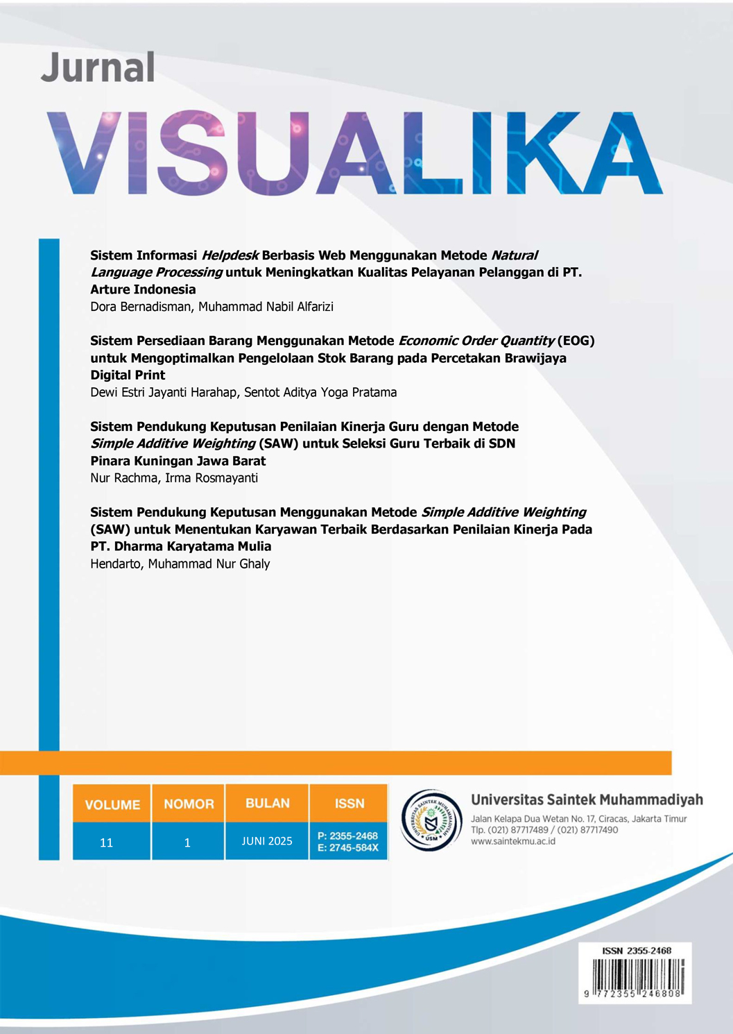 Vol. 11 No. 1 (2025)Pada Vol. 11 No.1 Juni 2025 ini, Jurnal Visualika ini menghadirkan sejumlah tulisan yang berisi pengetahuan yang menarik. Jurnal edisi kali ini memuat artikel: Sistem Informasi Helpdesk Berbasis Web Menggunakan Metode Natural Language Processing untuk Meningkatkan Kualitas Pelayanan Pelanggan di PT. Arture Indonesia, Sistem Persediaan Barang Menggunakan Metode Economic Order Quantity (EOG) untuk Mengoptimalkan Pengelolaan Stok Barang pada Percetakan Brawijaya Digital Print, Sistem Pendukung Keputusan Penilaian Kinerja Guru dengan Metode Simple Additive Weighting(SAW) untuk Seleksi Guru Terbaik di SDN Pinara Kuningan Jawa Barat, dan Sistem Pendukung Keputusan Menggunakan Metode Simple Additive Weighting (SAW) untuk Menentukan Karyawan Terbaik Berdasarkan Penilaian Kinerja Pada PT. Dharma Karyatama Mulia.
